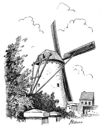 Die ehemalige Windmühlenanlage besteht heute noch aus dem „Mühlenstumpf“ und den eingeschossigen Anbauten, dem ehemaligen Maschinen- und Kornhaus. Mit dem Bau der sog. „Holländischen Steinmühle“ in Backstein wurde am 12. August 1812 begonnen. Bei dieser in genügender Höhe über den Bodenwirbeln errichteten Windmühle war nur die als Dach dienende Kappe, die Haube, drehbar. Die vier holzgefertigten Flügel des Windrades waren an einem Kreuzkopf befestigt, der am Ende einer Holzwelle angebracht war. Der Bau dieser Mühle wurde im Auftrag einer Bauernvereinigung durchgeführt und 1813 vollendet. 1846 wurden ergänzend ein Schuppen und ein Wohnhaus gebaut. In der Nacht vom 12. auf den 13. Dezember 1848 brannte die Innenausstattung der Mühle vollständig aus, die Wiederherstellung erfolgte 1849. 1884 wurde die Mühle durch einen Blitzschlag stark beschädigt. Trotz des Einbaus einer Dampfmaschine konnte die Mühle mit den inzwischen entstandenen Großmühlen in Krefeld und Neuss nicht konkurrieren. 1911 wurde die Windmühle stillgelegt. Im Jahre 1914 erfolgte die Umwidmung der Mühle zu Wohnzwecken, nachdem die Mühlen steine mit entsprechender Mahlvorrichtung entfernt wurden.