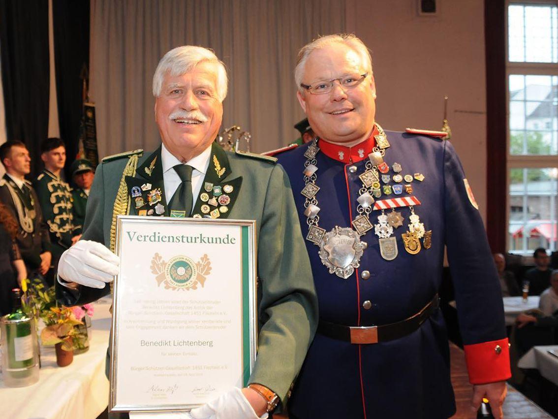 Benedikt Lichtenberg und seine Frau Hildegard, die Laudator Thomas Schlösser auf die Bühne holte, wurden für ‚40 Jahre Leitung und Ausbau des Schützenarchives‘ geehrt und erhielten Urkunde und Blumen. Thomas Schlösser erinnerte an das Unwetter 2021, bei dem ein großer Teil des Archives im Fischelner Rathaus Schaden genommen hatte. Er wünschte sich, dass die seit diesem Zeitpunkt bestehende Übergangslösung bald in eine langfristige Lösung übergeht. Als Geschenk durfte sich das Ehepaar Lichtenberg zudem über zwei Eintrittskarten für das demnächst von Adler Königshof ausgerichtete Kabarettprogramm mit Stefan Bauer freuen.
