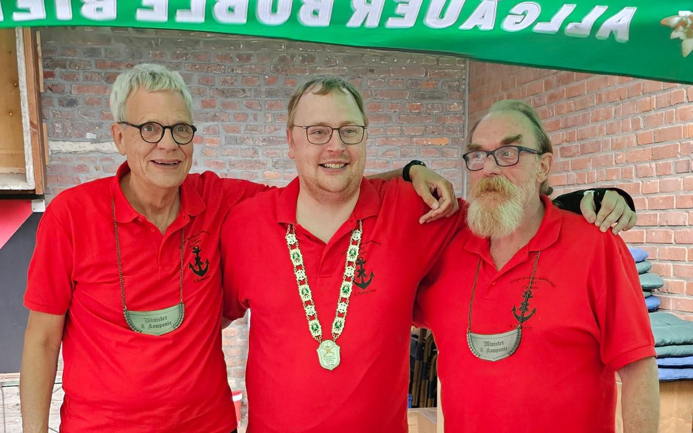 Mit dem 320. Schuss fiel dann auch der linke Flügel. Dietmar Winkels konnte die zweite Ministerwürde entgegennehmen. Schnell waren sich die Schützenbrüder einig, dass alle Teilnehmer nun um die Königswürde kämpfen werden. Es wurde ein harter Kampf. Immer wieder hatte man den Eindruck, dass der Vogel endlich fallen würde – einige Schüsse brachten das „Federvieh“ richtig in Bewegung – es tat sich aber nichts. Erst mit dem 499. Schuss brachte Christian Küsters den Vogel endlich zu Fall. Seine Kompaniefreunde gratulierten und feierten ihren neuen König. Die Ministerwürde übertrug er seinem Vater Werner Küsters.