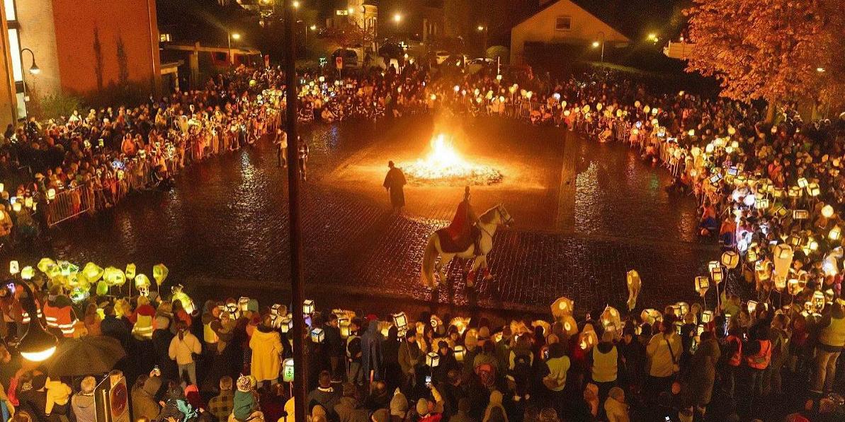 Der Martinszug mündete zum Abschluss auf den Marienplatz, wo das Martinsfeuer entzündet und die Martinsgeschichte vorgetragen wurde - schauspielerisch begleitet von Sankt Martin und dem armen Mann. Die symbolische Geste, als Sankt Martin dem armen Mann die Hälfte seines roten, wärmenden Mantels überreichte, erinnert an die Bedeutung von Nächstenliebe und Gemeinschaft. In einer warmen und festlichen Atmosphäre wurden gemeinsam - unterstützt von mehreren Musikkapellen - traditionelle Martinslieder gesungen.