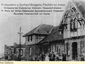 Am 15. Dezember 1898 wurde der Betrieb auf der ersten elektrischen Schnellbahn-Strecke Europas zwischen Düsseldorf und Krefeld aufgenommen, heute bekannt als „K-Bahn“. Dem Charakter der damaligen Schnellbahn – sie fuhr mit ca. 40 km/h – entsprechend, besaß die Strecke eine vollkommen vom Straßennetz abgekoppelte Trasse. Diese mied naturgemäß die Zentren der von ihr berührten Ortschaften. Die Anlage erforderte somit kleine Haltestationen an der Peripherie der jeweiligen Gemeinden. Zeittypisch wählte man hierfür ein Empfangsgebäude mit malerischen und unterschiedlich geformten Elementen. Zunächst entstand im Einklang mit dem Konzept ein parallel zum Gleiskörper geführter Backsteinbau, dem im Norden rechtwinklig einübergiebelter Trakt in Fachwerkbauweise angefügt wurde.