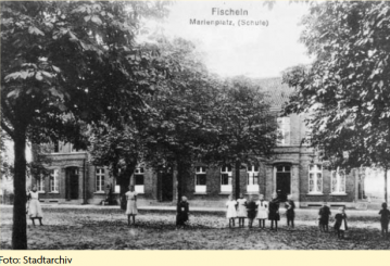 Der Grundstein für die Marienschule wurde am 6. September 1851 gelegt. Der Schulbau wurde 1852 fertig gestellt. Das Backsteingebäude bestand zunächst aus einer Lehrerwohnung und zwei Klassen. Eine dritte Klasse wurde im Erdgeschoss eingerichtet. Räume für die 4., 5. und 6. Klasse wurden in den Jahren 1856, 1859 und 1861 angebaut. 1915 wurde ebenfalls am Marienplatz ein Bau mit sechs Klassenräumen und einer Schulküche errichtet. Dieser Bau, der die katholische Volksschule beherbergte, wird heute als Nebengebäude der Grundschule Wimmersweg genutzt. 1854 bildete sich ein Ausschuss, ein sogenanntes Comité, von mehreren jungen Männern, die freiwillige Spenden sammelten, um auf dem nicht mehr genutzten früheren Friedhof – der neuen Schule gegenüber – ein Marienstandbild aufzustellen. Der Gemeinderat gab am 3. Oktober 1855 seine Einwilligung zur Aufstellung einer Säule. Bereits zwei Monate später, am 6. Dezember 1855, wurde eine Mariensäule aufgerichtet. Damit bekam die Schule ihren Namen „Marienschule“ und der gesamte Platz heißt seitdem „Marienplatz“. Die Mariensäule wurde von dem Kölner Bildhauer Hilgers (Madonna) und dem Uerdinger Steinmetz Louis Dicht (Sockel) entworfen und gefertigt. Sie ist in dieser Form eine der ersten Darstellungen des Marienbildes im öffentlichen Raum und damit eine der ältesten im protestantisch geprägten Preußen im 19. Jahrhundert. Die Mariensäule wurde am 8. Dezember 1855 von Pfarrer Wilhelm Heinrich Heinrichs eingeweiht und ist seitdem ein Wahrzeichen Fischelns. Die Patenschaft für die Pflege und Instandhaltung hat die St. Sebastianus-Bruderschaft an St. Clemens übernommen.