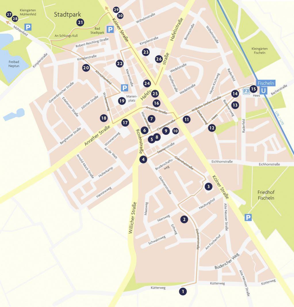 Anhand der interaktiven Imagemap, der Broschüre "Historischer Rundgang" oder auf der Website CLICK RHEIN des Landschaftsverband Rheinland können Sie sich einen Überblick verschaffen.